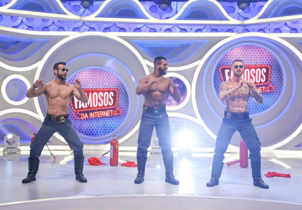 Rick Moreno, Ricardo Negro e Yuri Bonotto como bombeiros no programa “Eliana”, em 2023 • Divulgação